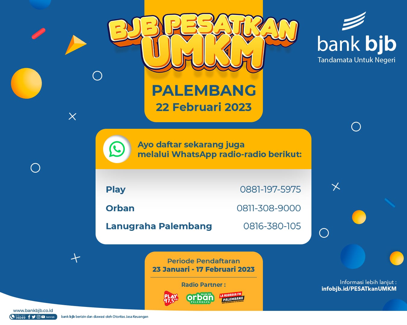 Talkshow bjb PESATkan UMKM di Palembang akan diselenggarakan pada Rabu, 22 Februari 2023 di Kota Palembang. Informasi selengkapnya dapat diakses di laman web infobjb.id/PESATkanUMKM. (Rls/Ayu/Djavatoday)