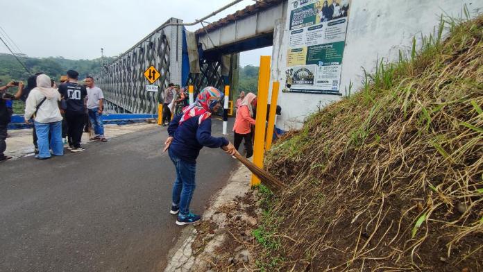 Warga dari Desa Pawindan dan Desa Panyingkiran bersama unsur TNI-Polri terlihat kompak menyapu, memungut sampah, hingga memangkas rumput liar yang tumbuh di sepanjang akses menuju jembatan. Aktivitas gotong royong ini berlangsung sejak pagi, menyasar area mulut lorong hingga sisi-sisi jembatan.