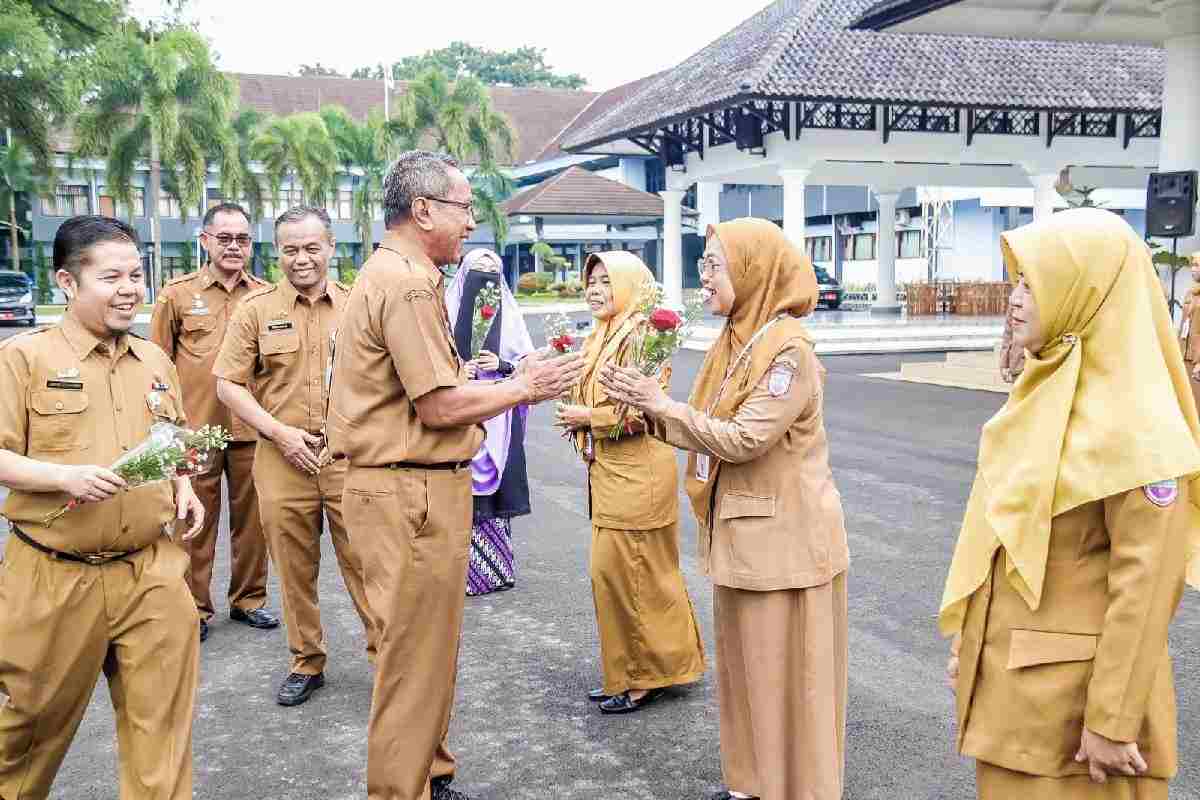 Momen paling menyentuh terjadi ketika empat pegawai perempuan senior dipanggil ke depan barisan. Mereka dipilih sebagai representasi sosok pengabdi yang telah lama berkontribusi di lingkungan Setda Ciamis. Di hadapan rekan kerja, keempatnya menerima bunga sebagai simbol penghargaan atas dedikasi yang telah mereka berikan selama bertahun-tahun.